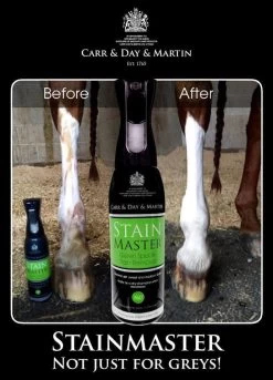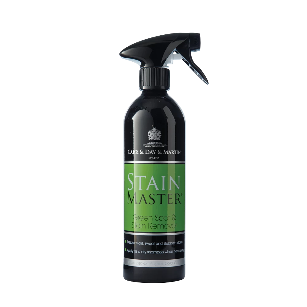 Ideal for removing dirt and manure stains with no need to rinse. Fantastic for last minute show touch ups as an βon the spotβ brightener for white markings. Stain Master can also be used as a dry shampoo when itβs too cold to bath.