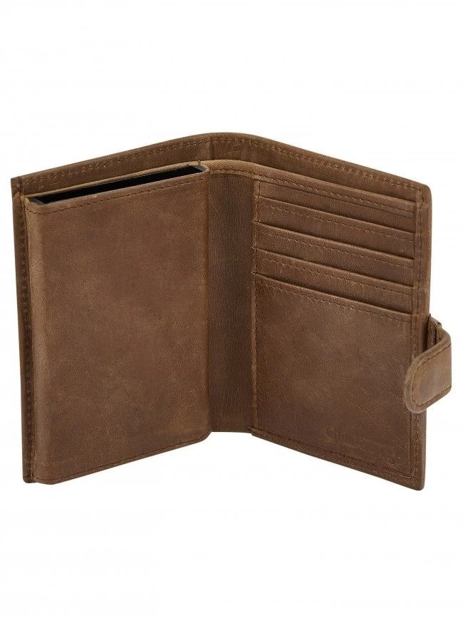 For the days when you want to be streamlined, you need the Thurles mini wallet. Made in chestnut leather it holds up to 6 cards which are protected by a secure RFID metal cardholder. Slim enough to comfortably sit your pocket, with a push lever pops cards out of the wallet when you need them, so thereβs no fiddling about. β Slim Leather wallet.
