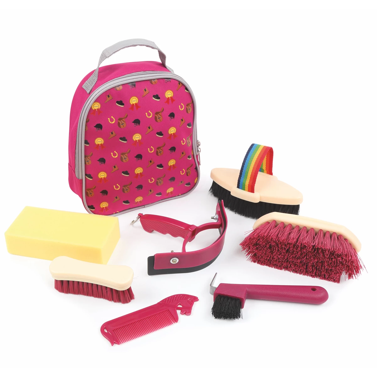 - Grooming kit designed for little hands in a zip close bag with carry handle. Contents: dandy brush, body brush, face brush, sponge, horse character comb, hoof pick/brush, sweat scraper