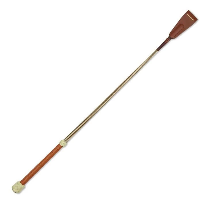 β’ This lovely quality whip features a punched leather handle, flared keeper with a threaded spiral stem, woven knot cap and metal stud