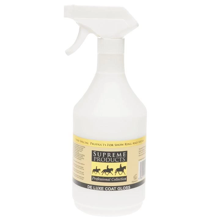 • Use Supreme Products De Luxe Coat Gloss when an outstanding finish is required – to polish the coat, lay the coat hairs and keep the coat laid without lifting, and as the base for producing the gleaming finish which is achieved with the application of Supreme Spray and Shine to the coat, Supreme Glistening Oil to the face and legs, hocks and dock and Supreme Sparkle to the mane and tail