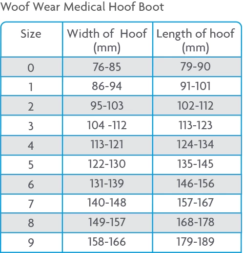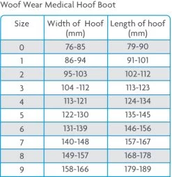 • Size 9: Width of hoof 158mm – 166mm, Length of hoof 179mm – 189mm